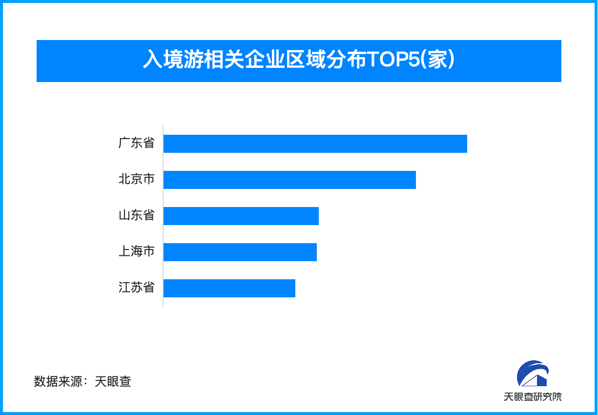 从地域分布来看,广东、北京以及山东,三地所拥有的入境游相关企业位居前列,分别有2.3万余家、1.9万余家以及1.2万余家。