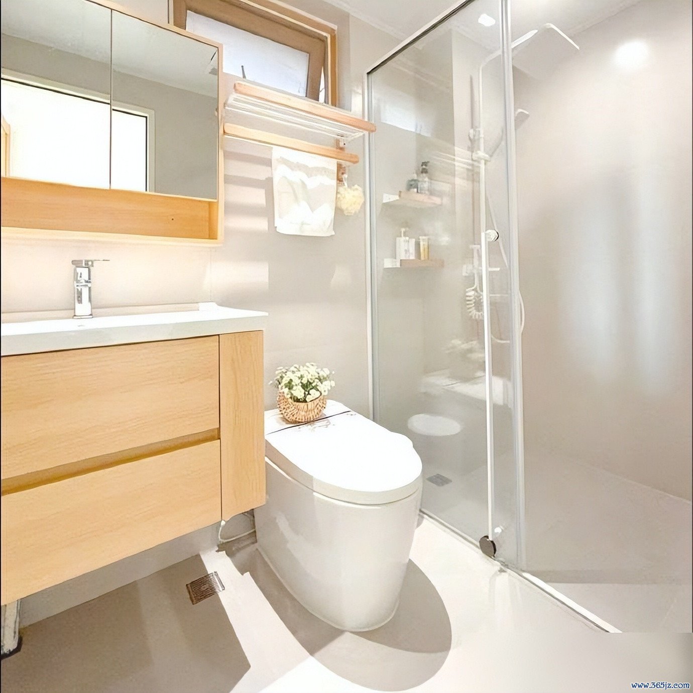玄关柜也是原木配白,能装又耐看。小户型收纳是头等大事,柜子做得好,家里一半的整洁就有了保障。卫生间虽小,干湿分离还是做了,这是长远打算。原木色的浴室柜挺提气,和浅色瓷砖搭着,清爽有品位。