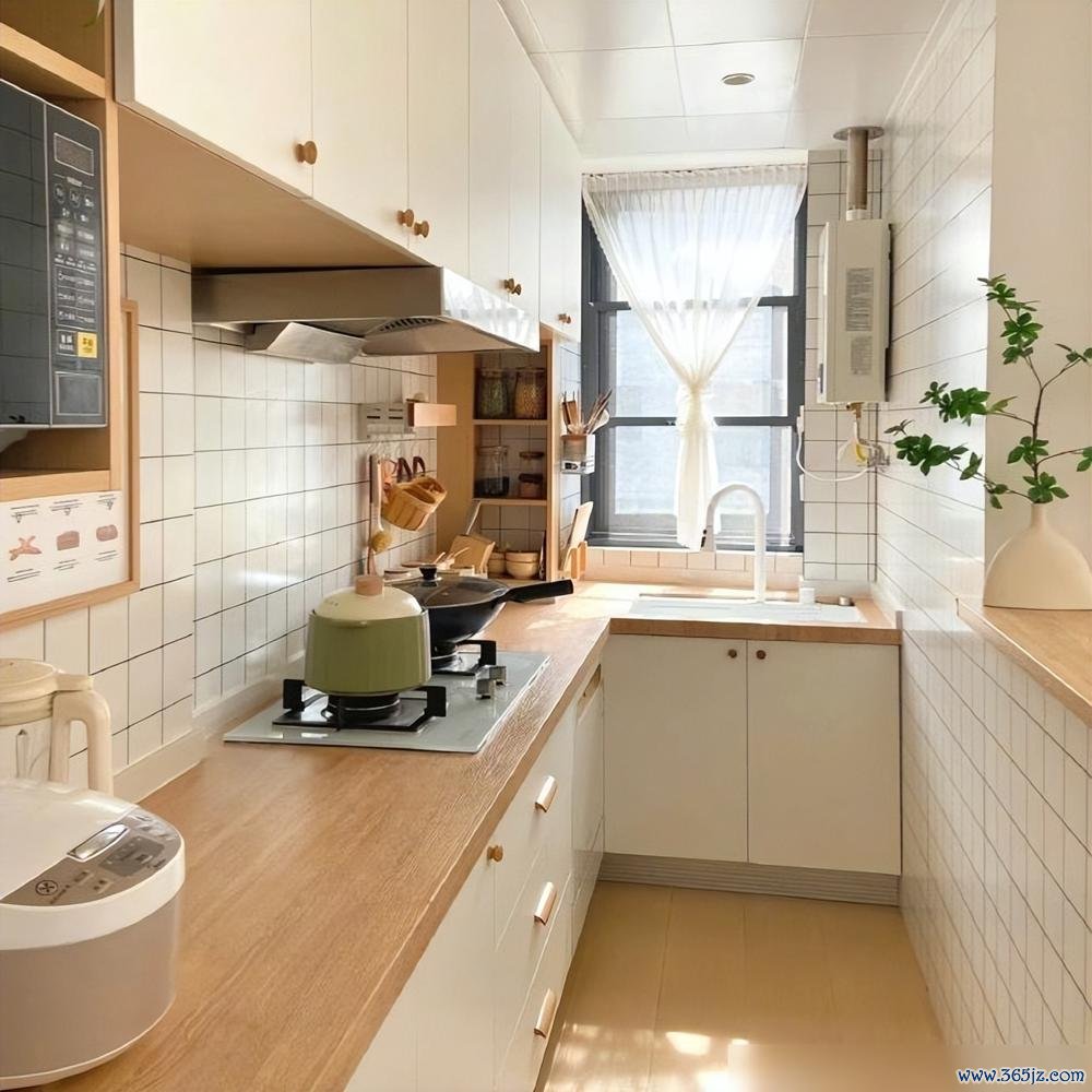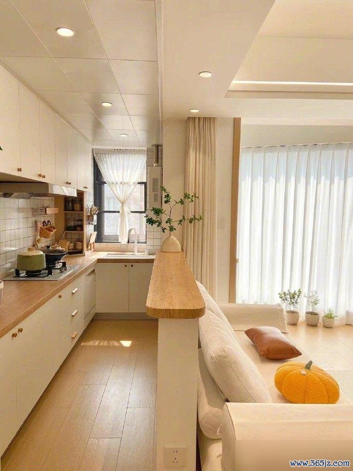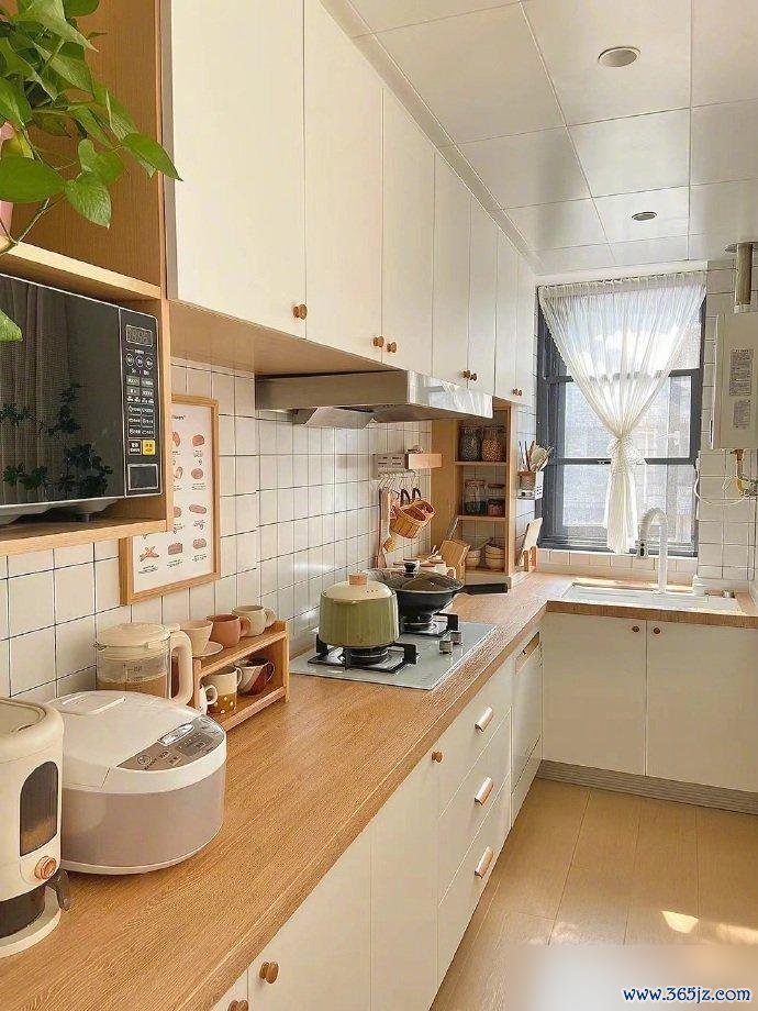 厨房和客厅半墙之隔,这设计挺巧妙。既分了区,又没完全堵死,空间还是连通的。开放式厨房最怕乱,可你看人家那台面,锅具调料瓶摆得整整齐齐。地柜吊柜都利用上了,连微波炉都有专门的地儿。勤快人住哪儿都干净,这话一点不假。L型的橱柜布局也合理,动线顺畅,做饭不累。窗户那层纱帘加得好,柔光一照,厨房都有了诗意。