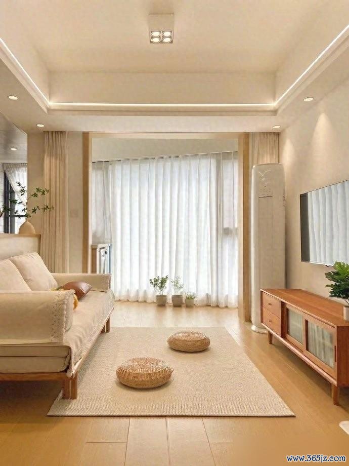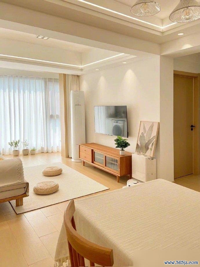 客厅看着是真舒服。没摆大茶几,就一张地毯两个蒲团,空间立马就显大了。这种思路值得很多小户型借鉴。东西少了,心就不烦。柔和的色调配上简约的家具,温馨感自然就出来了。过日子要的不就是这份舒坦嘛。