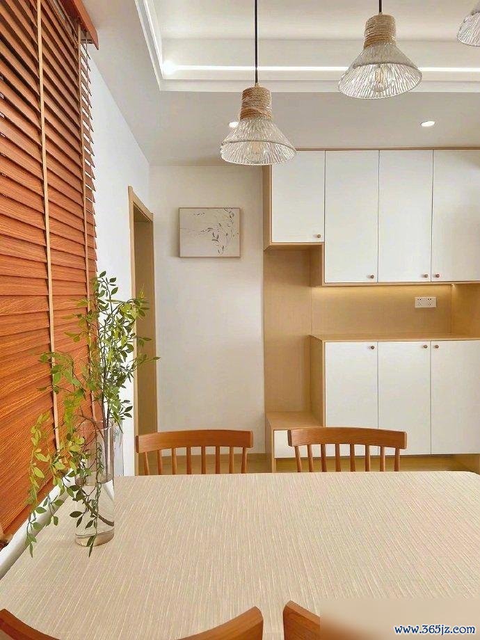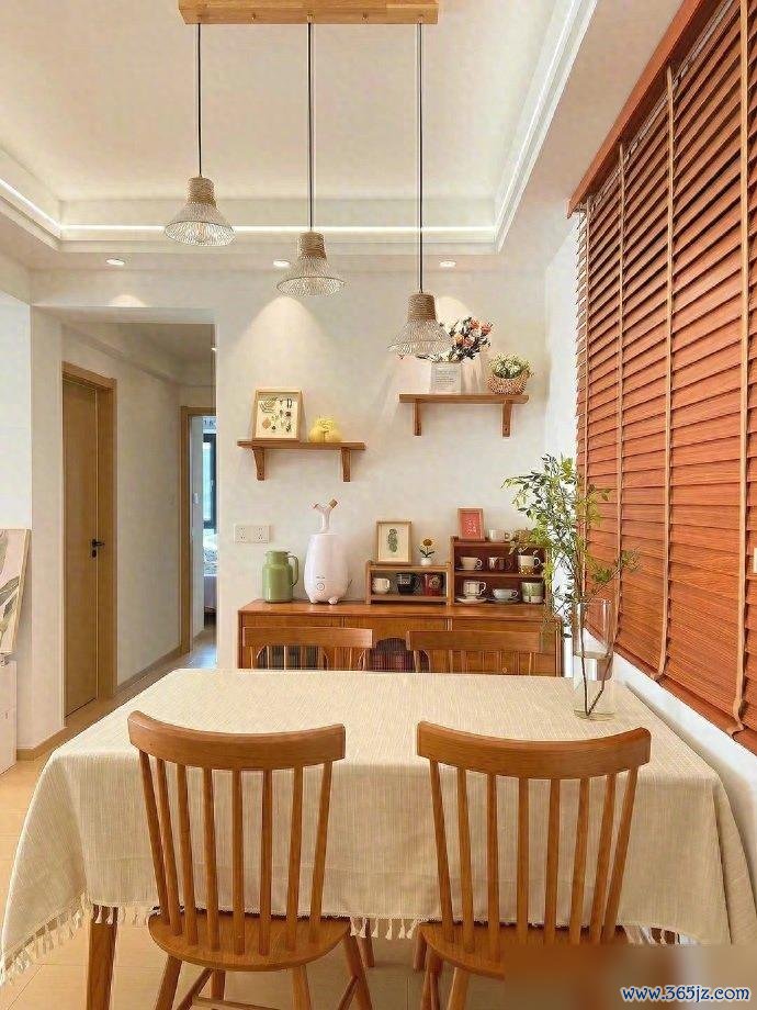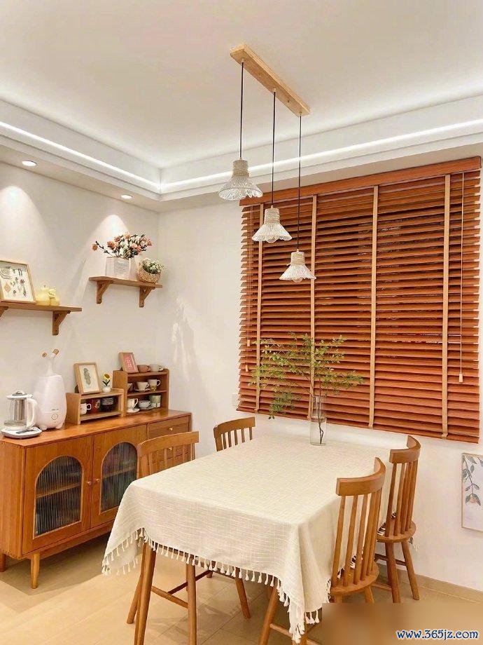餐厅的原木风看着就踏实。餐桌、餐边柜、窗帘,色调统一,自然质朴。硬装不用太复杂,几件有质感的原木家具,氛围一下子就起来了。墙上的花枝,桌上的水培绿萝,都是点睛之笔。家里有点绿色,心情都会不一样。生机勃勃的,看着就有盼头。
