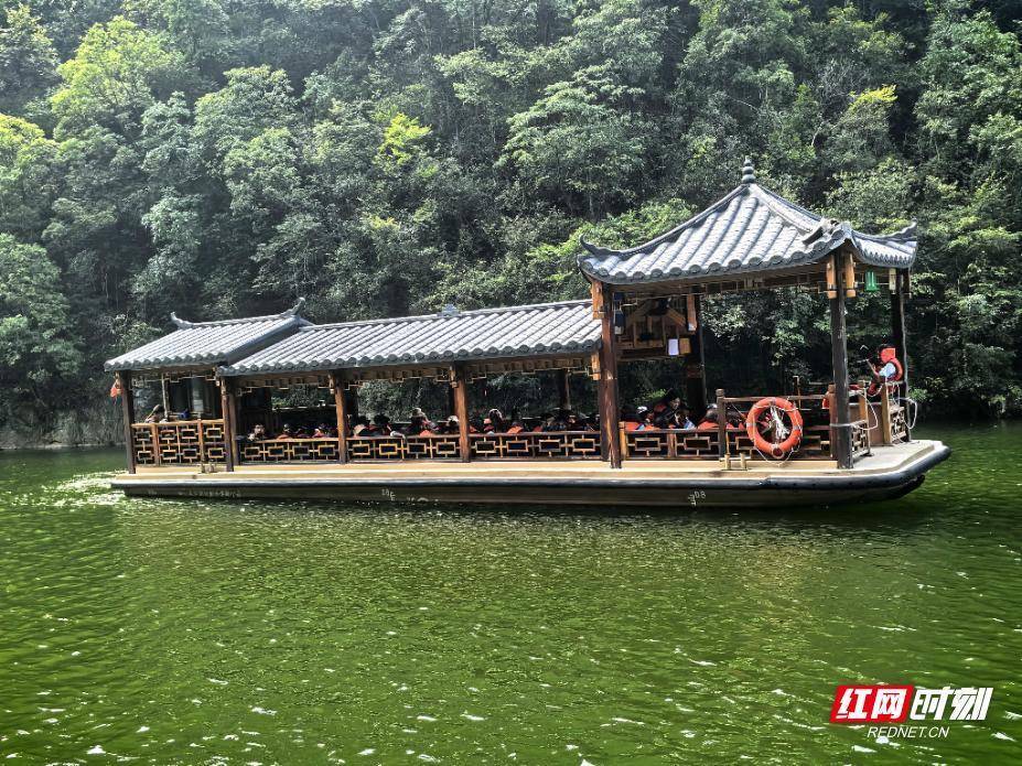 游船码头,几艘古色古香的游船静静停靠。游客们有序登船,踏入这如诗如画的山水之中。游船缓缓驶离码头,平稳地行驶在湖面上。船身两侧,是精致的木质结构,带有浓郁的中式韵味,与周围的自然山水相得益彰。