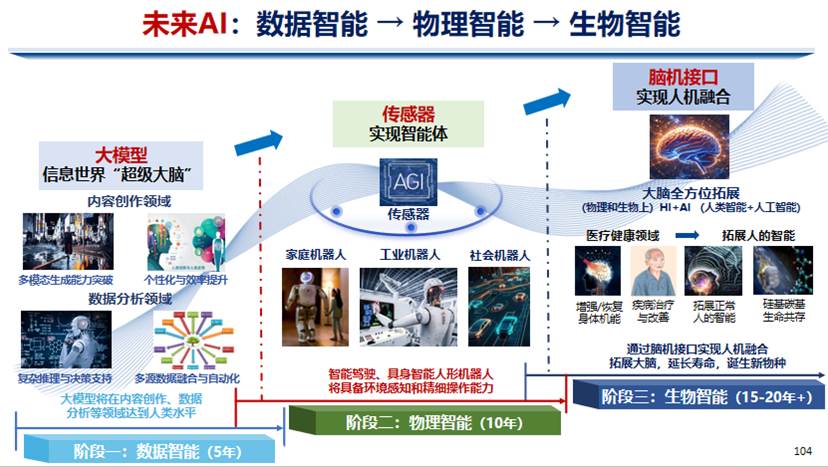当前,人工智能已深度融入人类社会,尤其在生物医学领域推动着基因解码、药物研发及精准诊疗的革命性突破。展望未来,郑海荣认为,人工智能将沿着“数据智能→物理智能→生物智能”的路径演进:数据智能依托算力与算法挖掘信息价值;物理智能赋予机器感知与行动能力;而生物智能将通过脑机接口实现人机智能深度融合,最终构建无创脑际通信——以神经信号直连替代传统通讯(如电话/微信),成为生命体间信息自由交互的终极载体。
