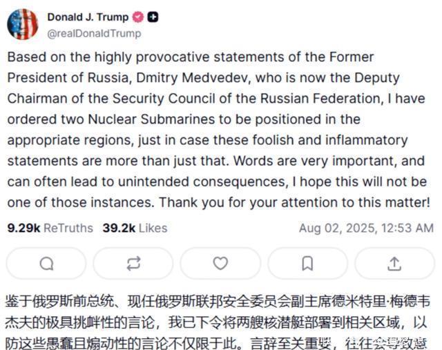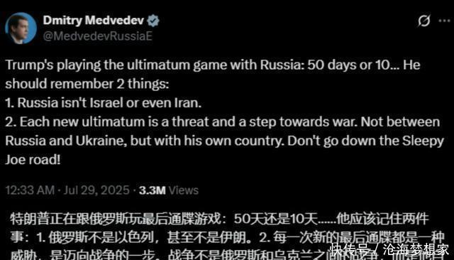 一、世界各地核对抗加剧 当前,美俄核对峙已经达成冷战后最高水平,2025年7月28日,特朗普在访问苏格兰时公开表达对普京不满,认为对方在俄乌停火一事上没有“顺从”自己的指导意见。 直接提出要将先前的50天限期停战缩短至8月8日,这一行为遭到俄罗斯联邦安全会议副主席梅德韦杰夫的言语回击。 声称特朗普这是在玩“最后通牒游戏”,并暗示俄罗斯拥有苏联时代的“死亡之手”核反击系统,以此提醒特朗普做法的危险性。特朗普在社交平台回怼梅德韦杰夫是“失败的俄罗斯总统”,随后双方言语升级。