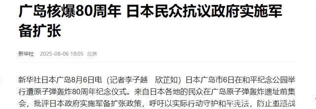 在发言的最后,松井一实认为日本政府应该带头统一分裂的国际社会,广岛会和全球8500多个成员城市合作,推广反军的和平文化。 总体而言,这次的广岛核爆纪念日活动核心是“反核”与“和平”,但在日本对二战历史根源的歪曲上,导致纪念活动更多成为日本包装自己为“战争受害者”的工具,也引发了国际社会对其真实意图的审视。 参考资料: 1、新华社《广岛核爆80周年日本民众抗议政府实施军备扩张》