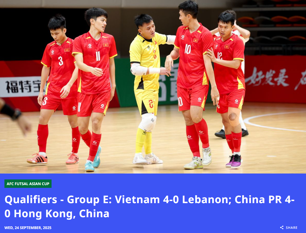 这场荣誉比赛,中国队迎来了大爆发,第8分钟依靠一个乌龙球先下一城,随后第16分扩大领先优势,下半场再进两球,最终取得4-0的大胜,同组另外一场比赛,越南队4-0大胜黎巴嫩队。